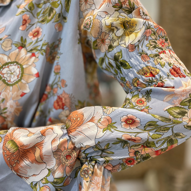 - Detalhes: Blusa azul com estampado floral. Cintura elástica. Folhos na base, mangas e peito.