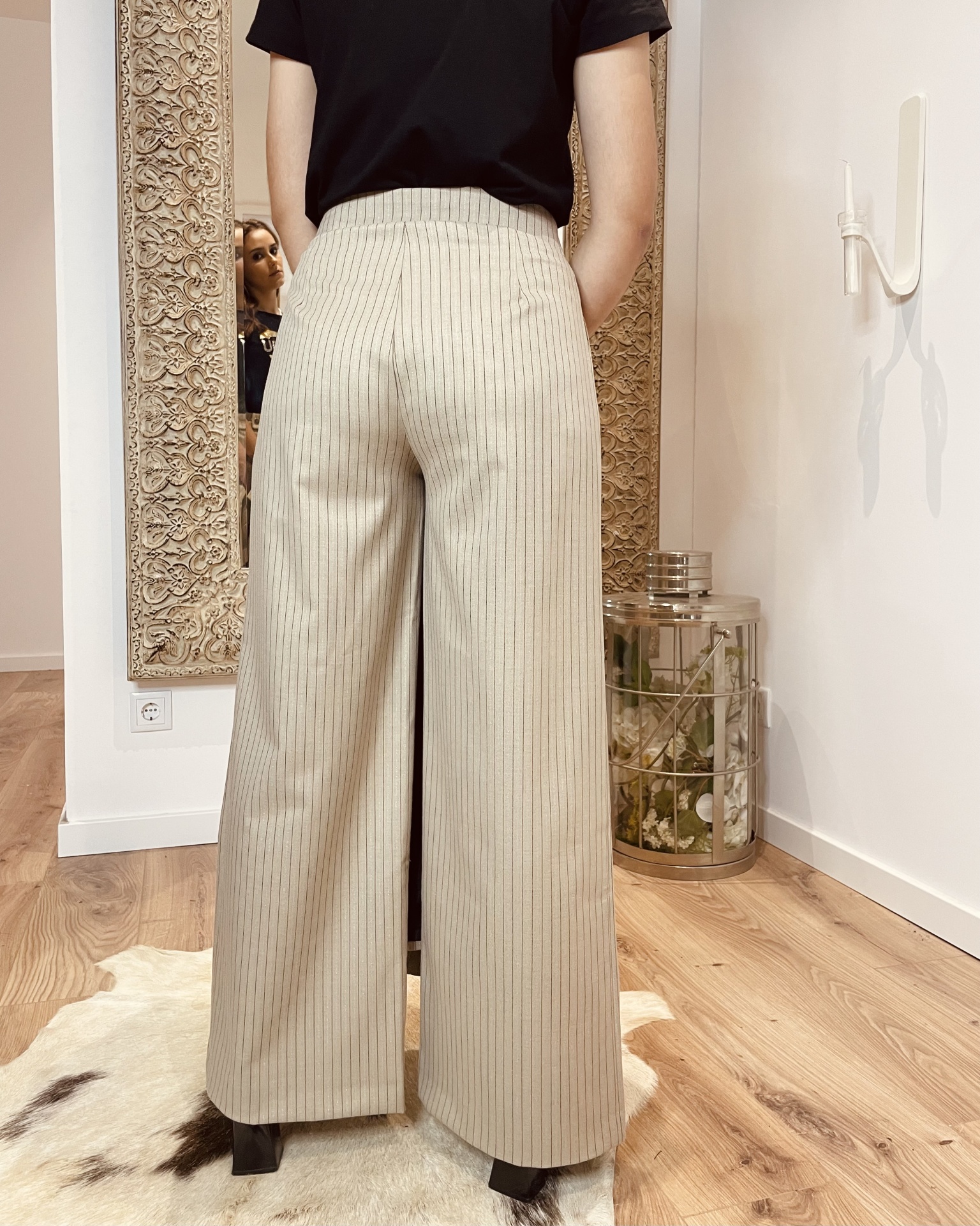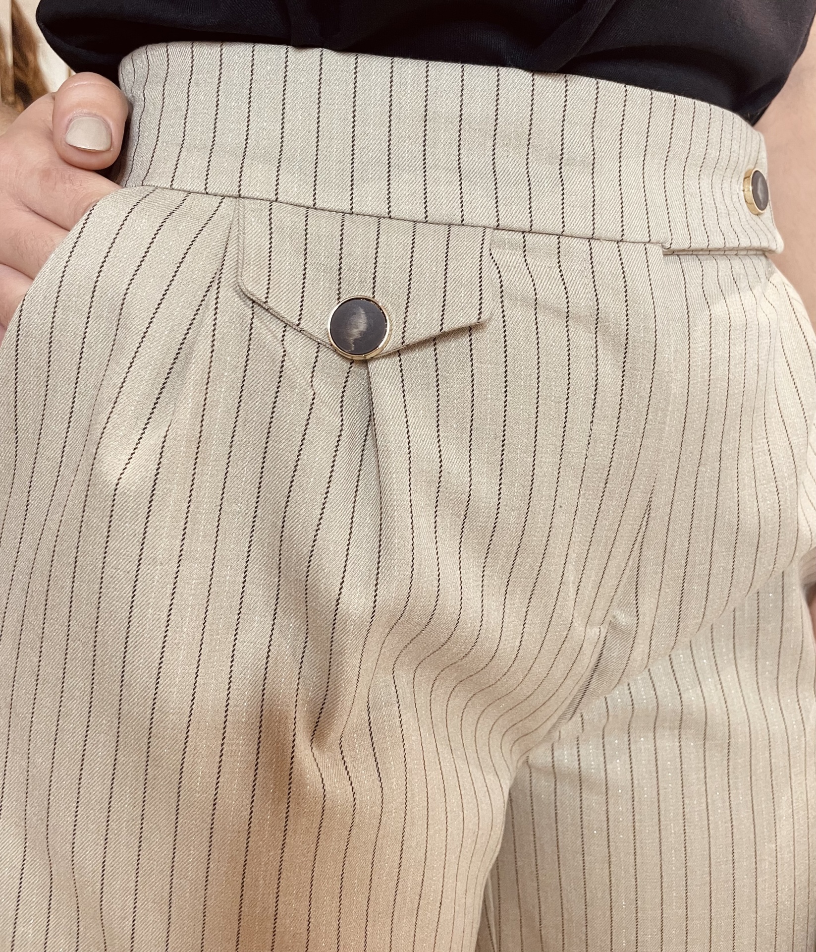 - Detalhes: Calça bege com riscas camel e prateadas. Modelo largo.