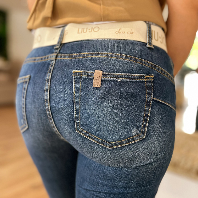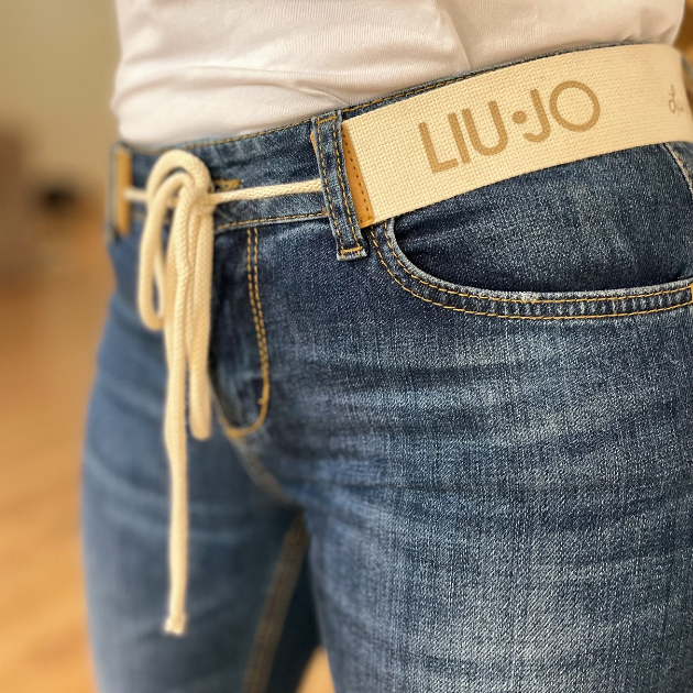 - Detalhes: Calça de lavagem escura com efeito de rasgos. Cintura média/alta. Cinto bege com logotipo da marca, íncluído.