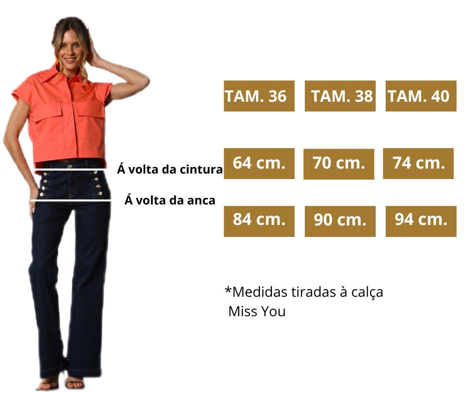 - Detalhes: Calça de cintura súbida. Modelo largo. Botões dourados trabalhados, frontais, a decorar. Fivelas para cinto.