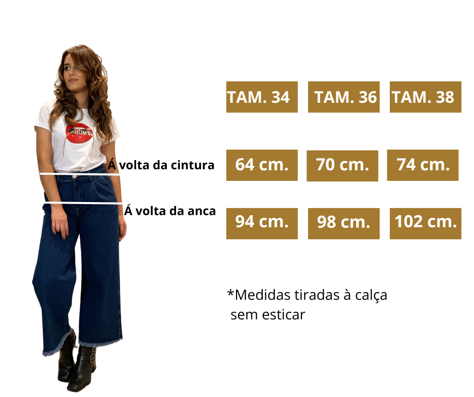 - Detalhes: Calça modelo largo. Cintura súbida. Baiinha desfiada.