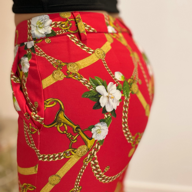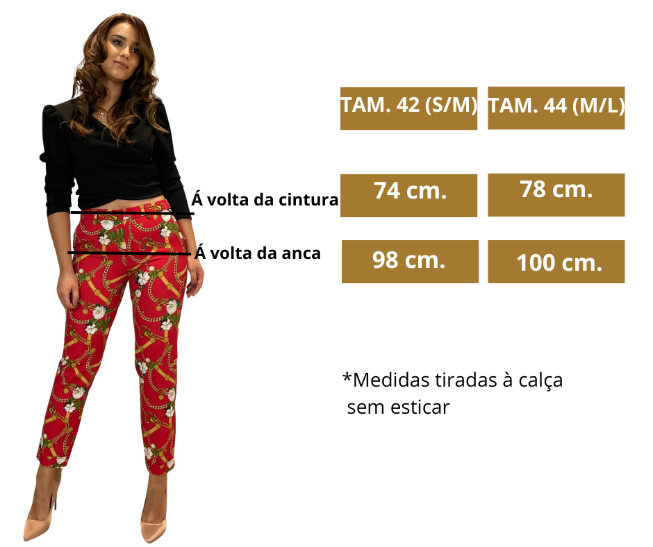 - Detalhes: Calça vermelha com estampado multicolorido. Fivelas para cinto. Cintura média/alta.
