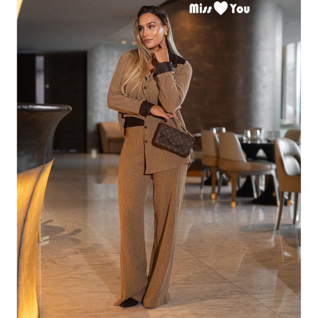 A camisa apresenta um design único, com gola e punhos em tom mais escuro, criando um contraste subtil e sofisticado. Já a pantalona garante conforto e movimento, alongando a silhueta com um caimento impecável.