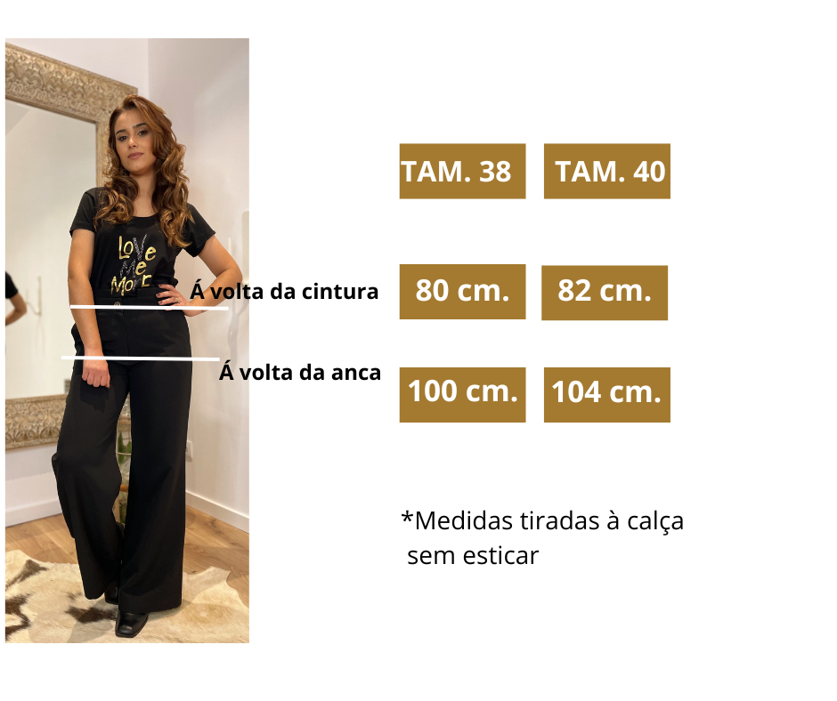 - Detalhes: Calça modelo clássico, perneira larga. Cintura súbida.