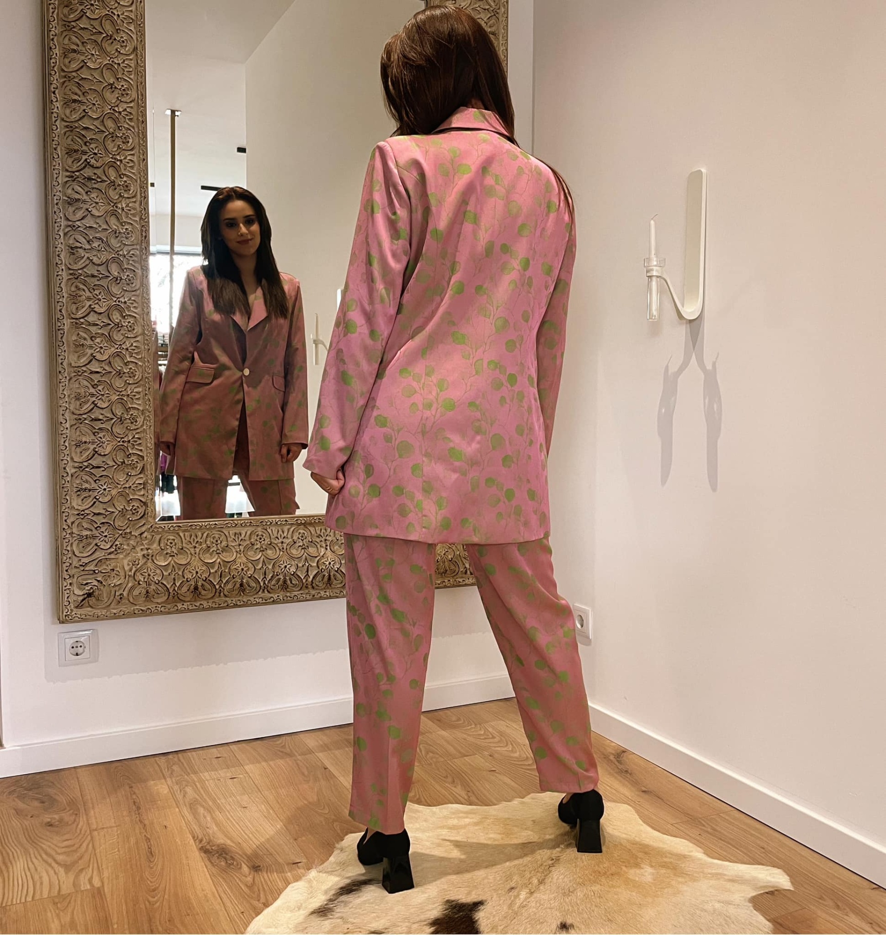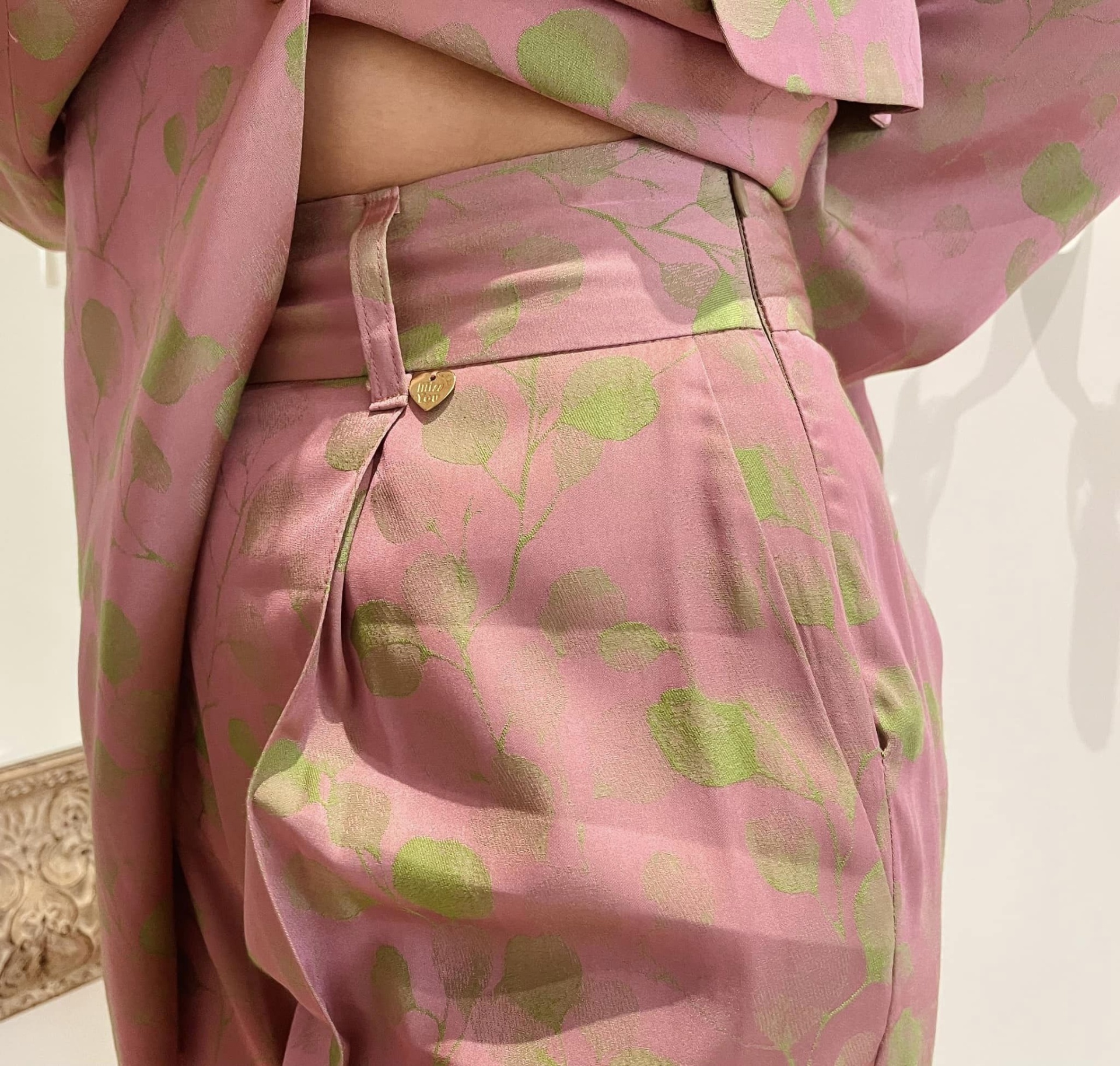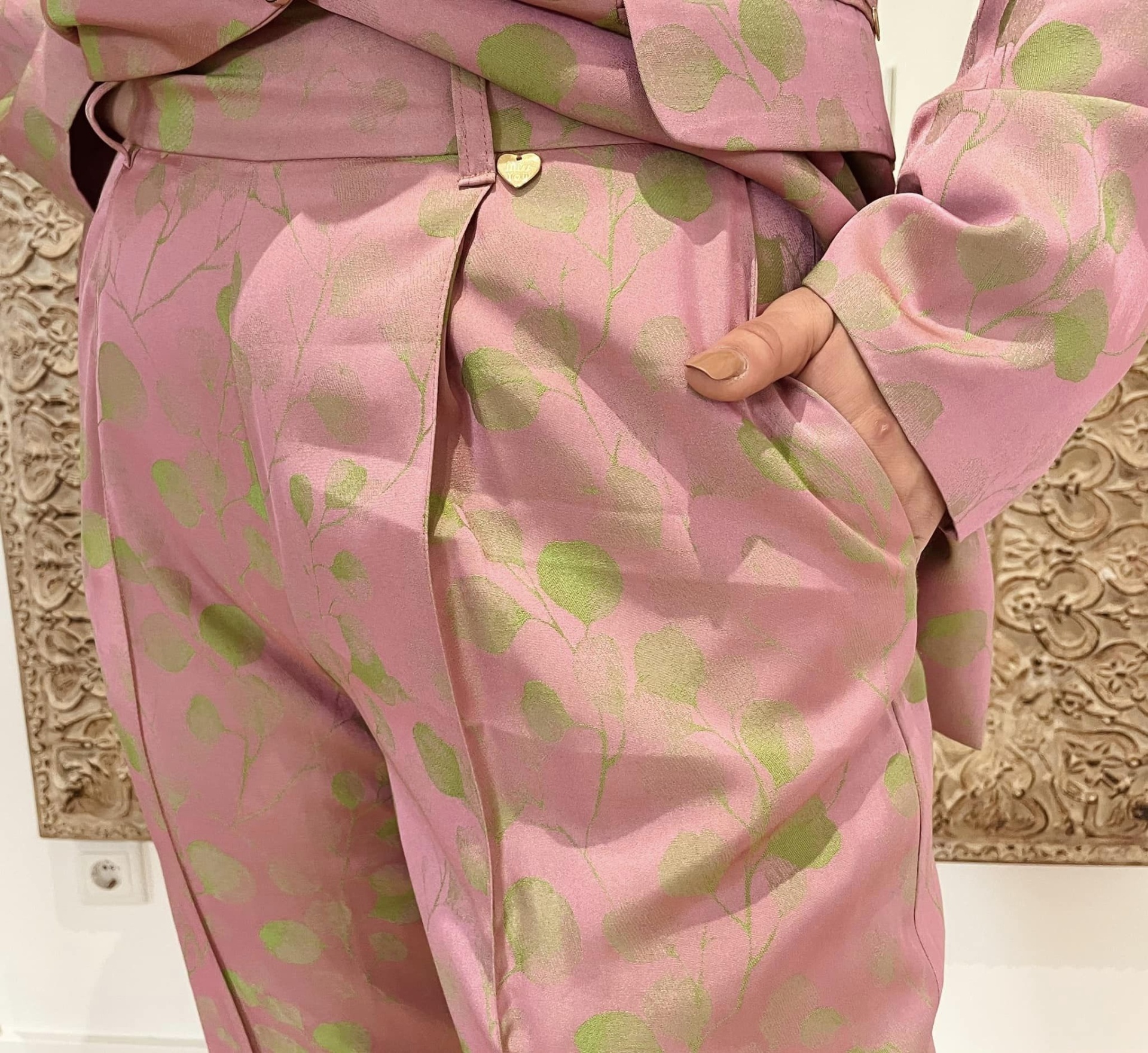 - Detalhes: Calça rosa com padrão floral em verde. Fivelas para cinto. Cintura súbida. Pinças frontais.