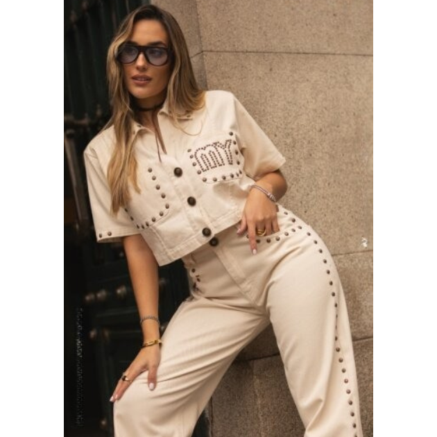 • Detalhes: Calça de sarja bege com tachas douradas. Descrição "MY" em tachas douradas no bolso traseiro.