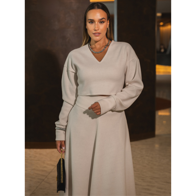 Confeccionadas num tecido suave e estruturado, ambas as peças apresentam um toque delicado e caimento impecável. O tom pérola transmite leveza e modernidade, tornando este conjunto perfeito tanto para ocasiões especiais como para momentos mais descontraídos.