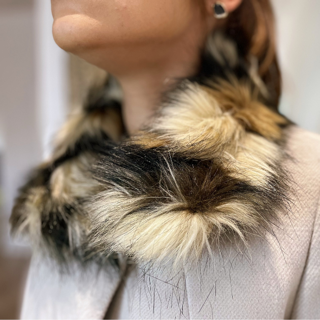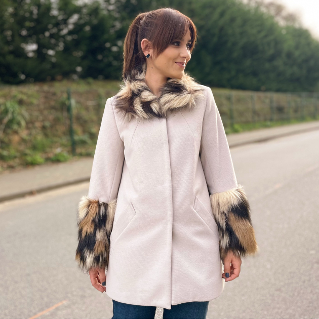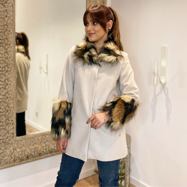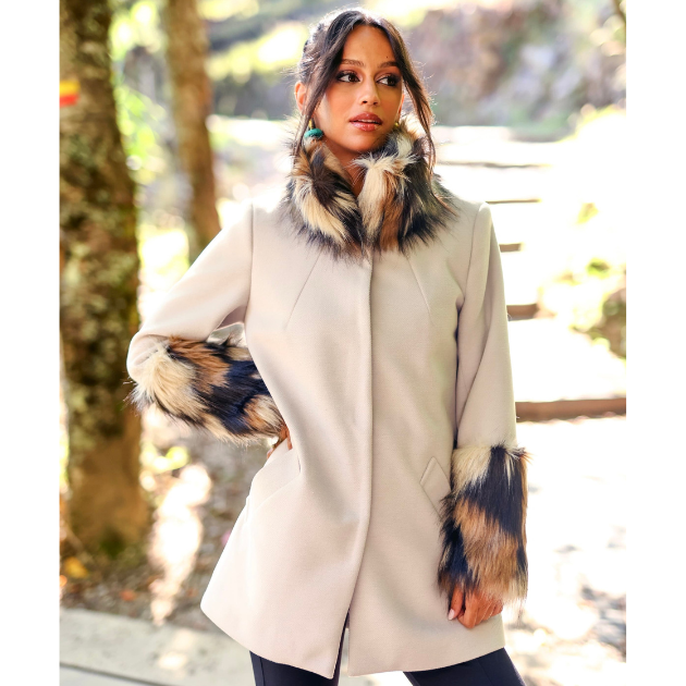 - Detalhes: Casaco comprido. Pêlo tricolor na gola e mangas.