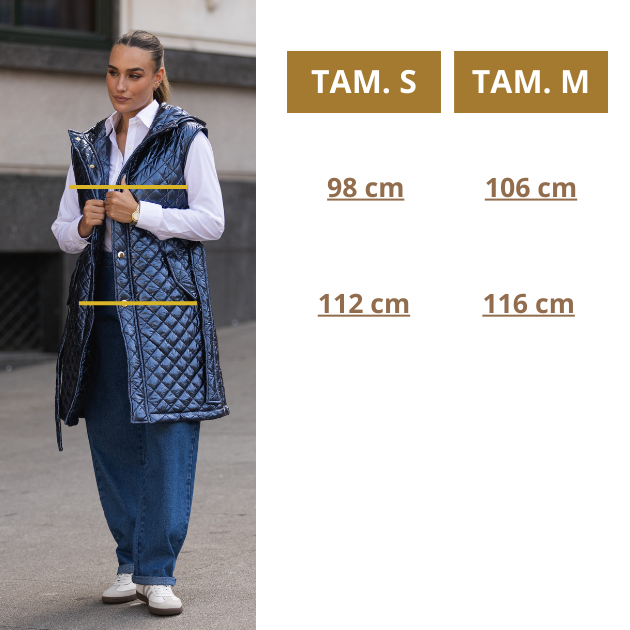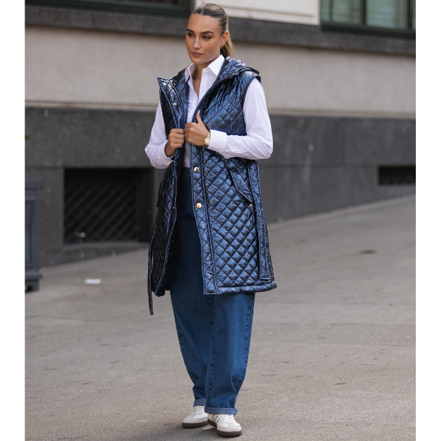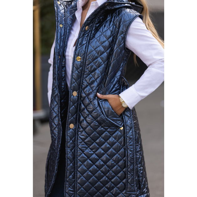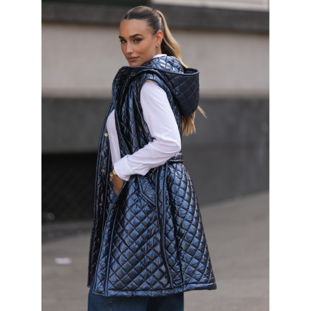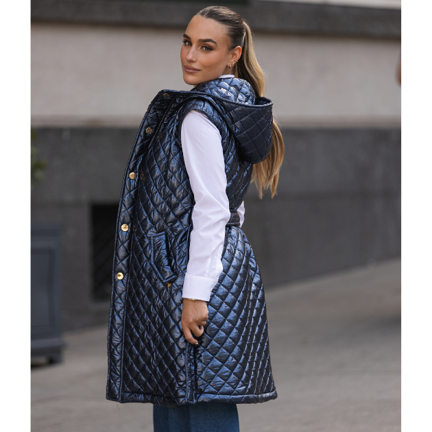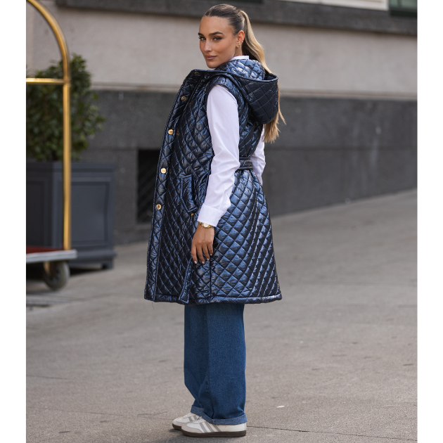 Eleve os seus looks de outono/inverno com este colete comprido acolchoado feminino em azul metálico.