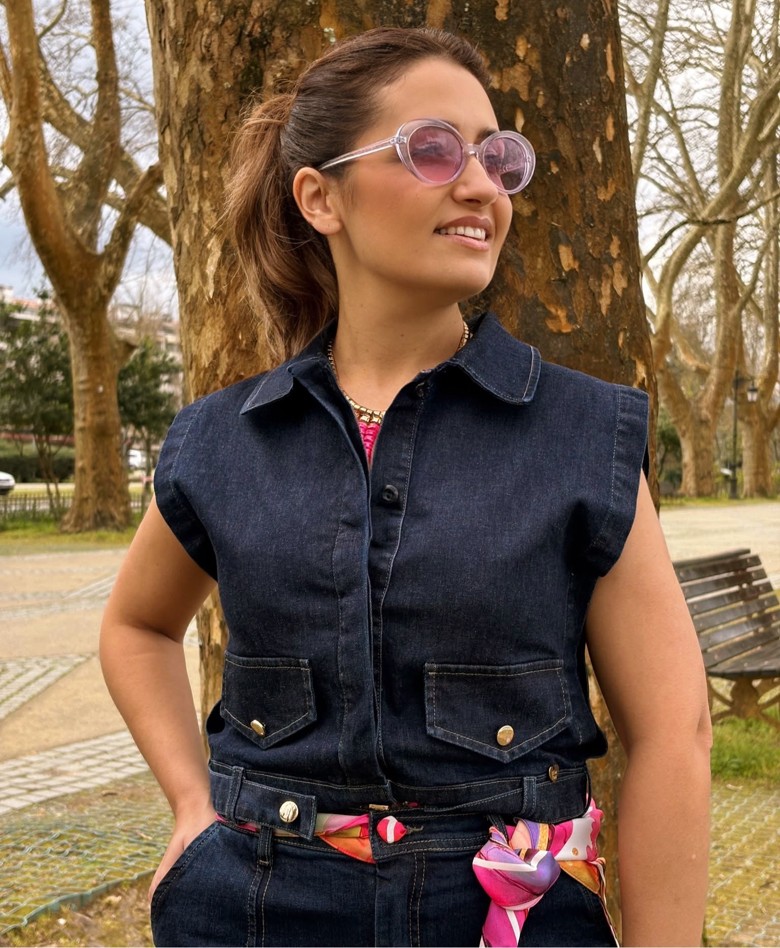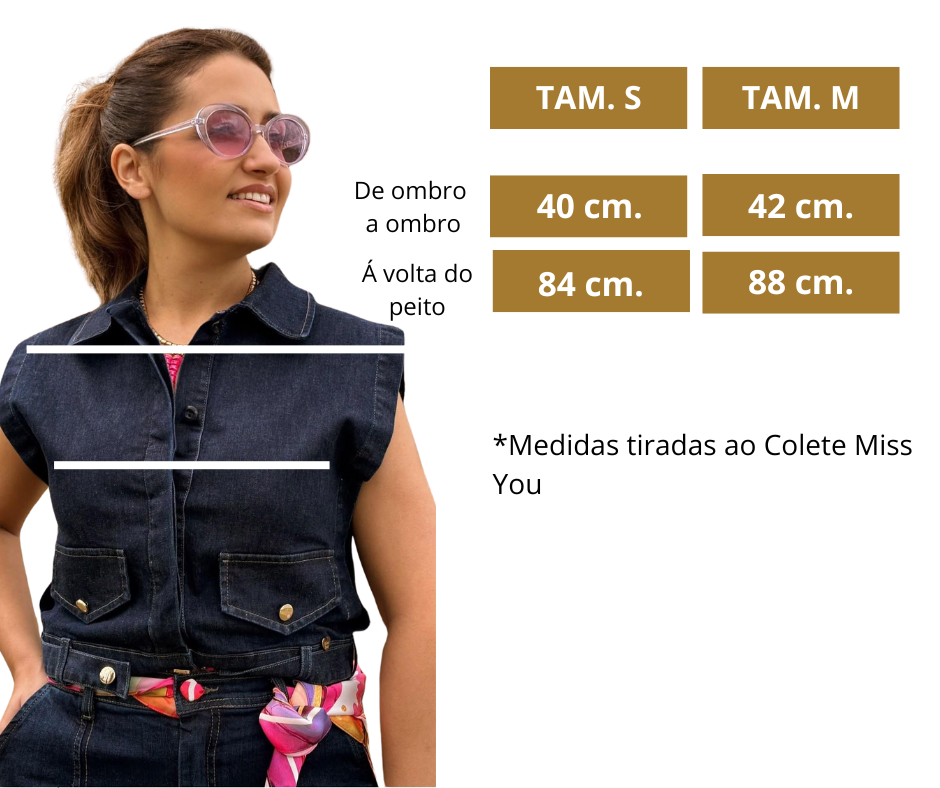 - Detalhes: Colete de manga curta. Enfeite de bolsos.