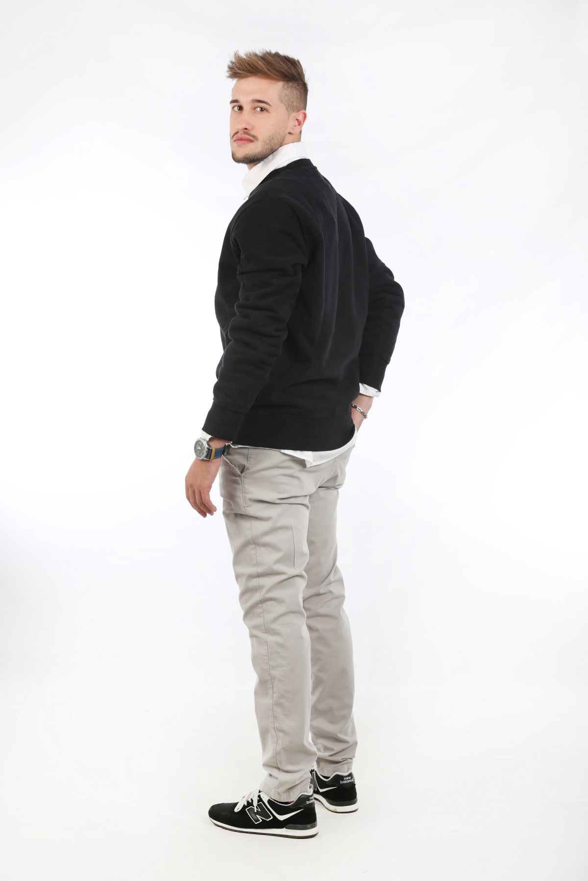 Homem com camisola preta e logótipo laranja, calças cinza claras e ténis pretos