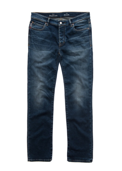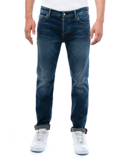 Calças de ganga azul escuro slim fit com detalhes desbotados e bolsos