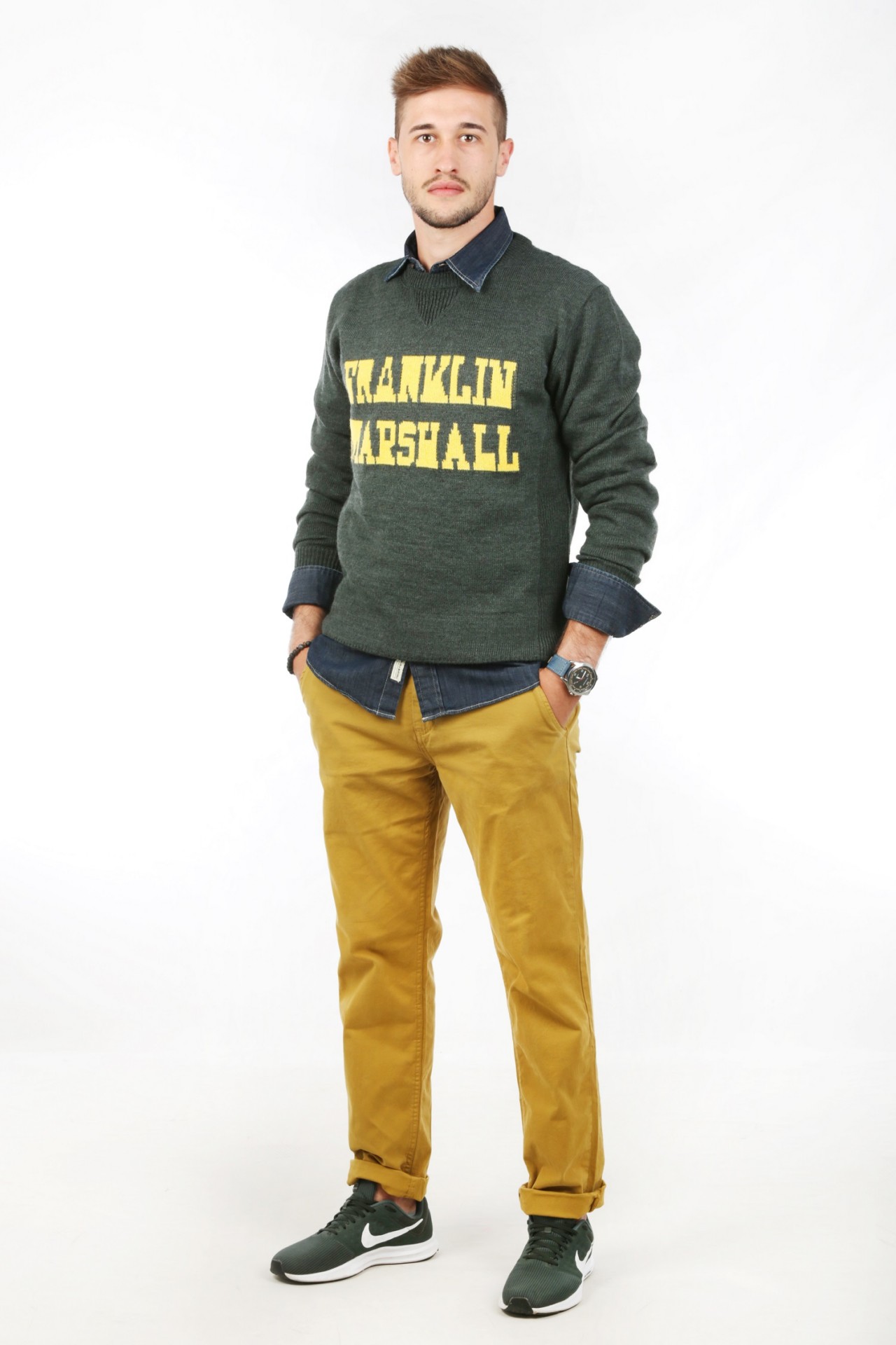 Homem com camisola verde 'FRANKLIN MARSHALL', calças khaki e sapatilhas verdes