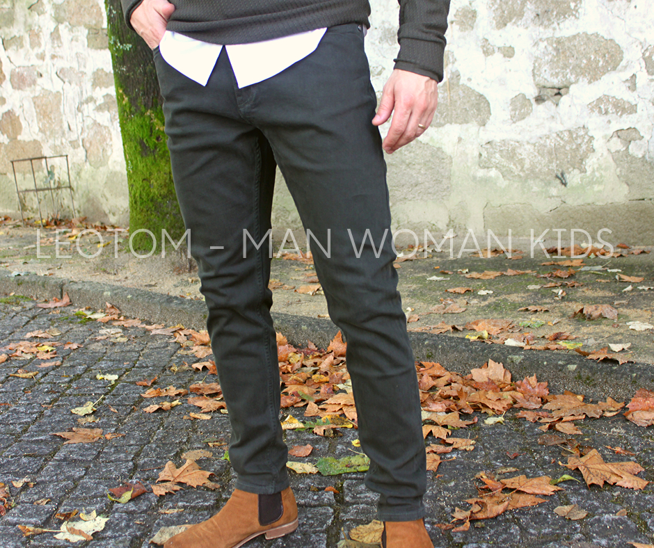 Pessoa vestindo calças pretas, camisa branca e camisola cinza, em chão de pedra com folhas secas