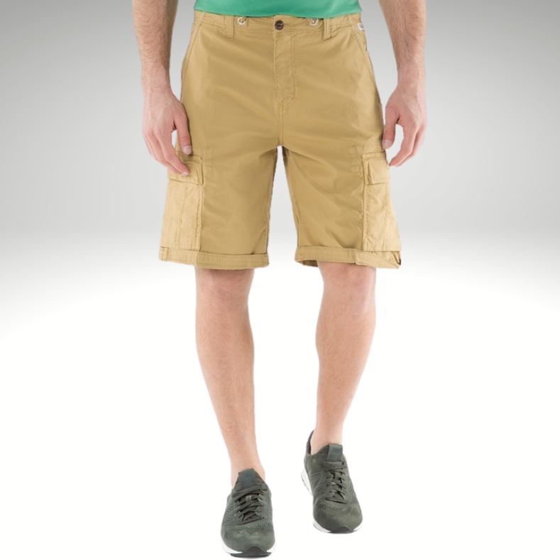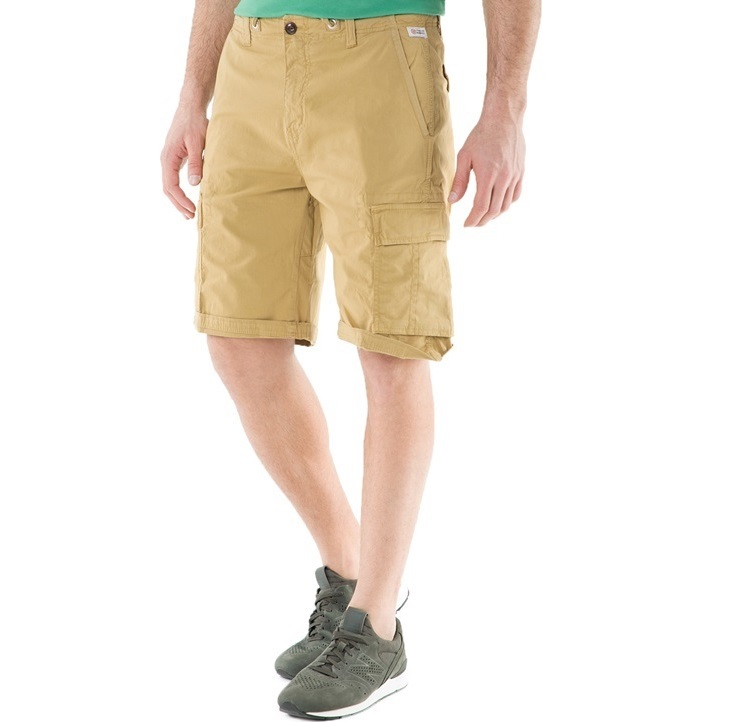 Calções cargo bege masculinos em tecido algodão com bolsos laterais tipo cargo.