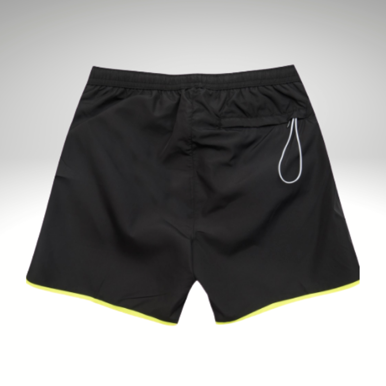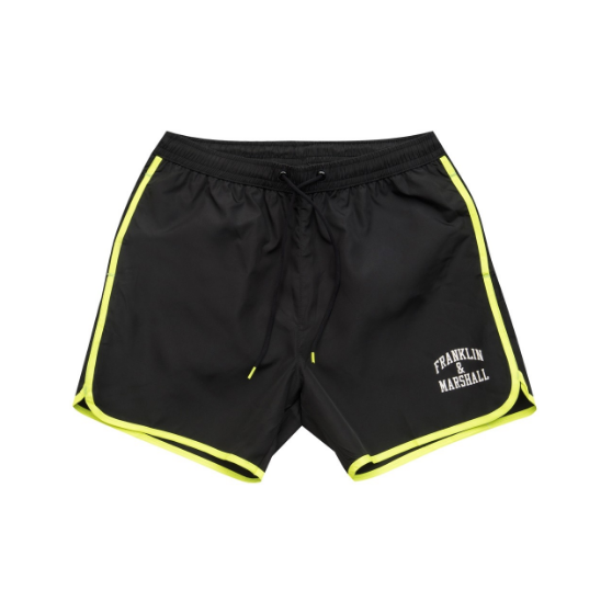 • Detalhes: Calção de banho preto. Logotipo de letras em arco impresso na coxa esquerda. Forro de malha com bordas elásticas. Borda contrastante.