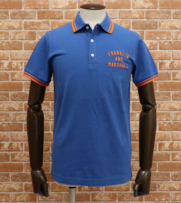 Polo azul com gola laranja e azul, texto FRANKLIN AND MARSHALL, em manequim