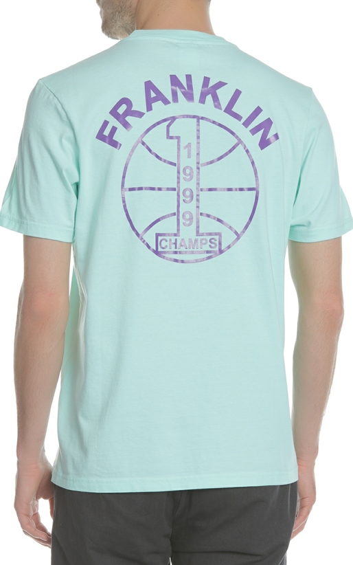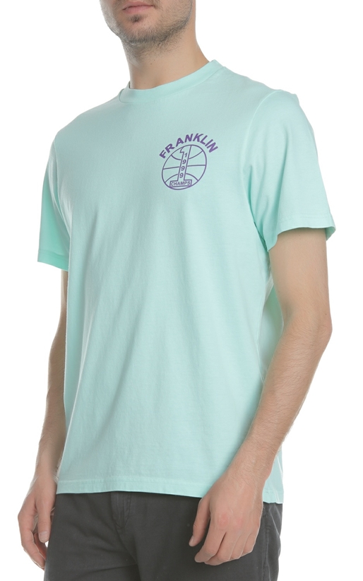 • Detalhes: T-shirt verde água com pequeno estampado frontal, lado direito em lilás. O mesmo motivo estampado nas costas, em grande também em lilás.