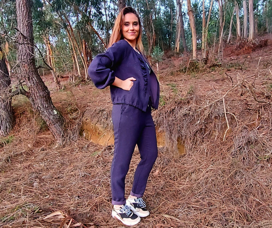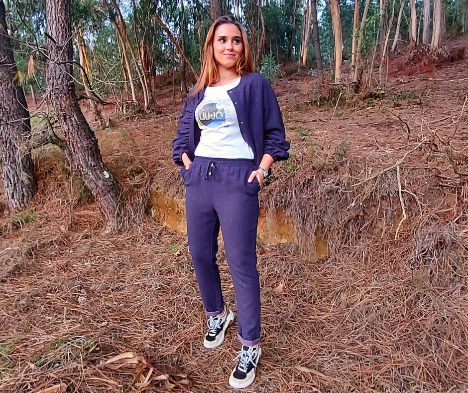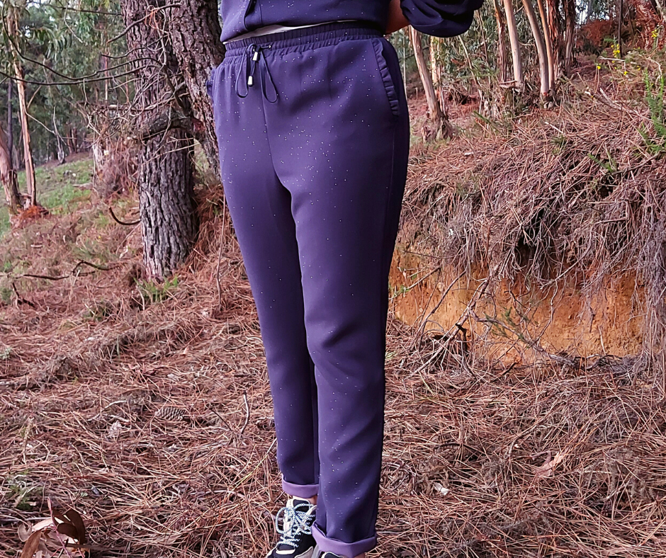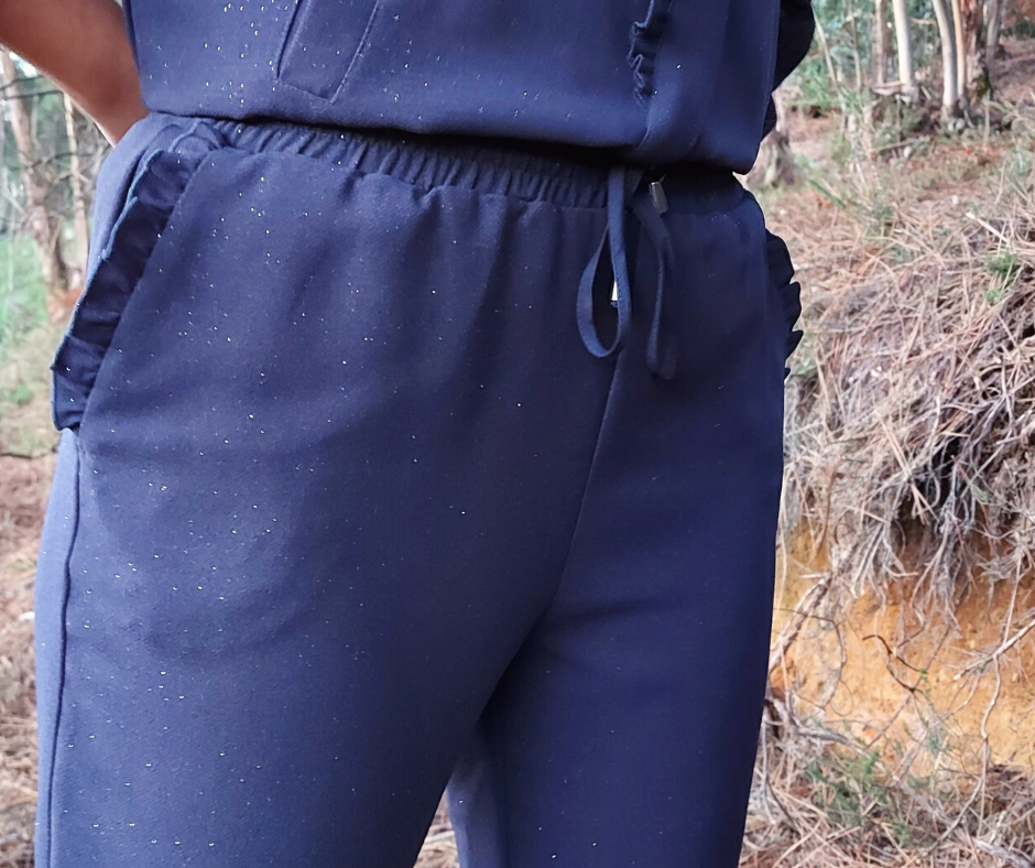 - Detalhes: Calça azul marinho com brilhos prateados. Detalhe de folho nos bolsos. Cintura elástica com cordão para ajustar.