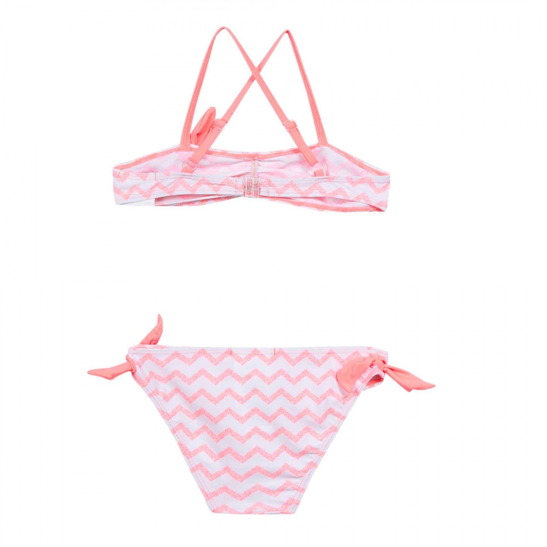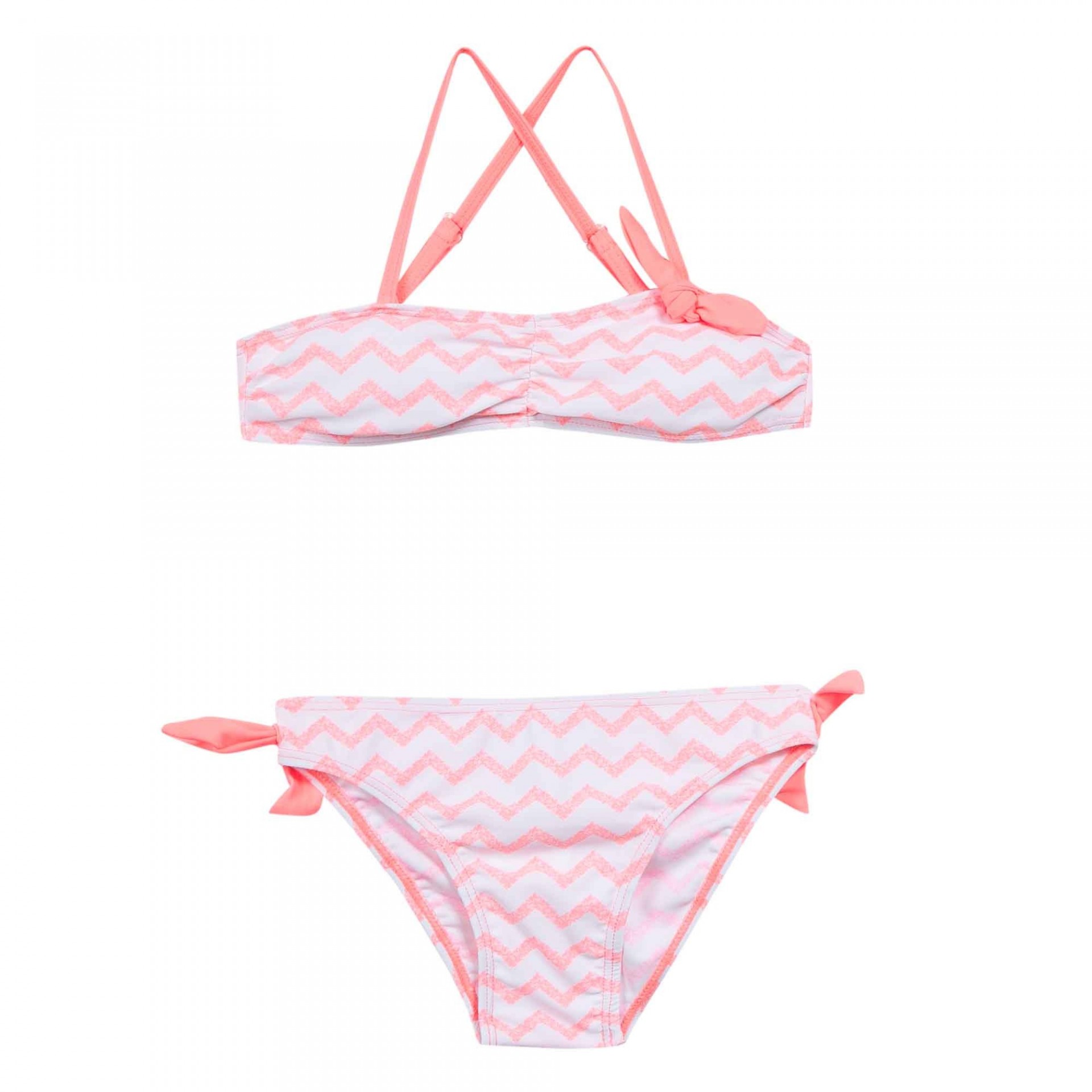 Fato de banho infantil rosa com padrão zigzag branco e laços
