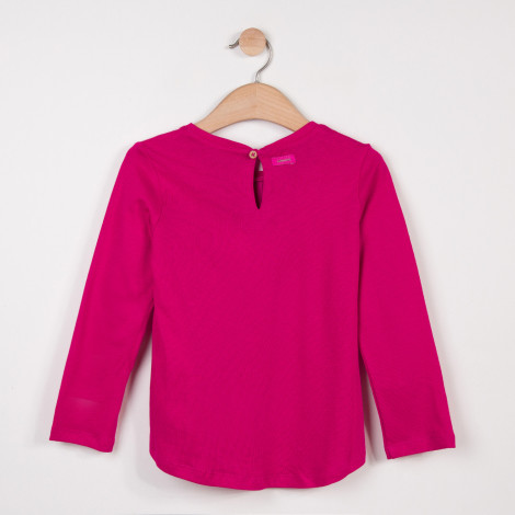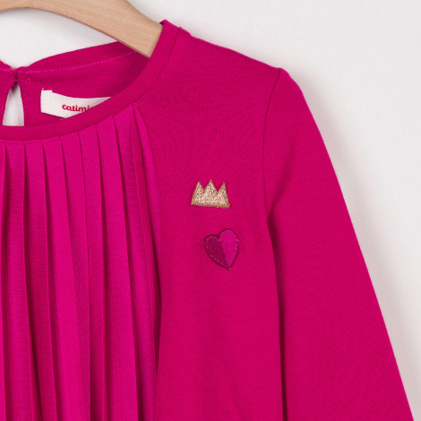 Pormenores: Camisola de manga comprida em dois materiais. Tecido em jersey ultra macio em peônia rosa apresenta plissado na frente de cetim de malha. Dois remendos Catimini no peito. Gola redonda. Etiqueta Catimini.