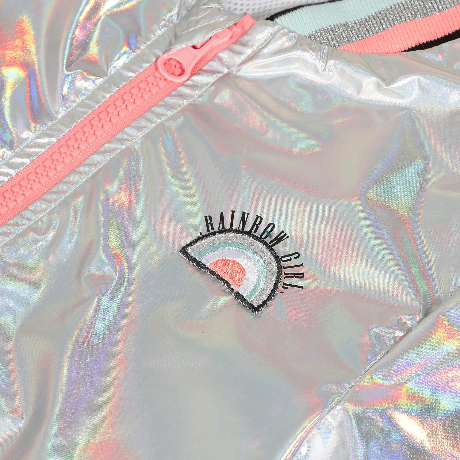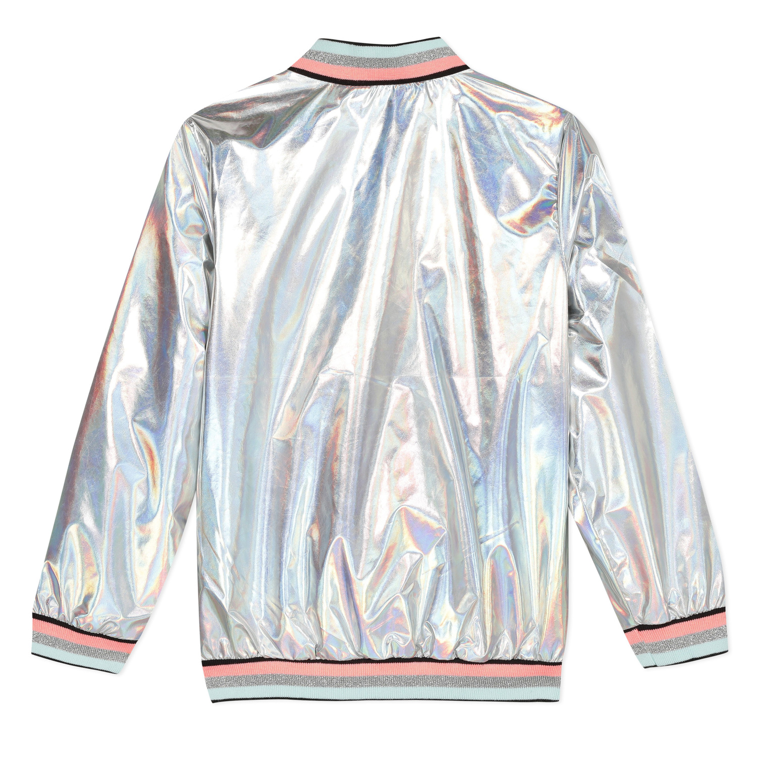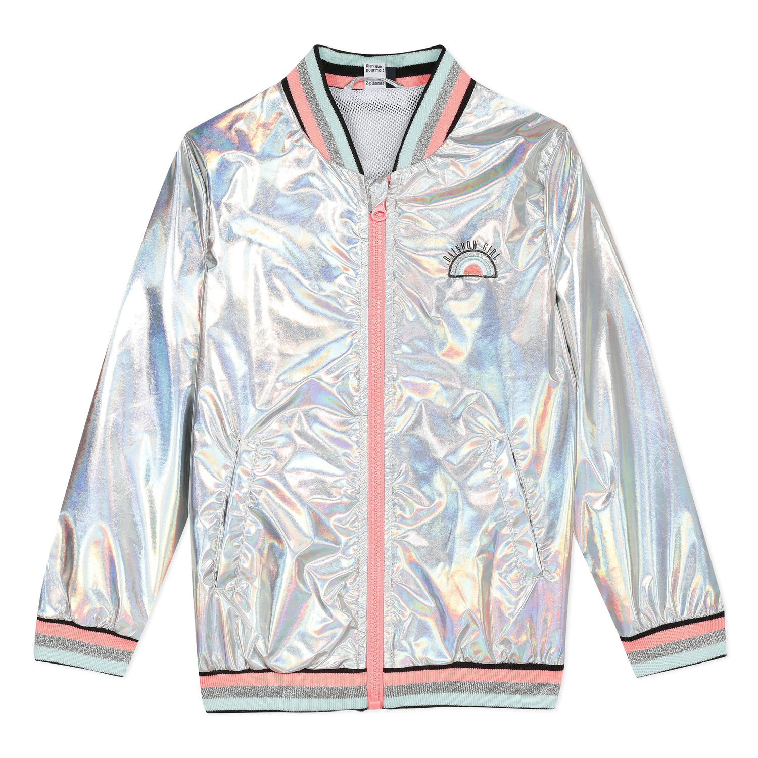• Detalhes: Bomber prateado com listras coloridas na gola, mangas e base inferior. Detalhe na zona do peito, lado direito. Fecho rosa.