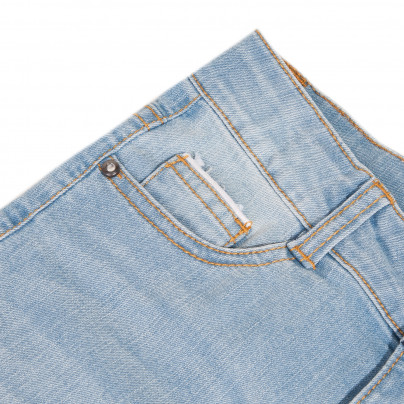 • Detalhes: Calças jeans azul-céu de corte reto. Botão verde água e detalhes nos bolsos traseiros.