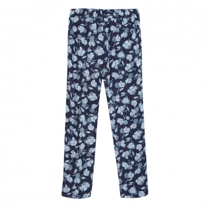 Calças compridas azul escuro com padrão de folhas brancas e cordão vermelho