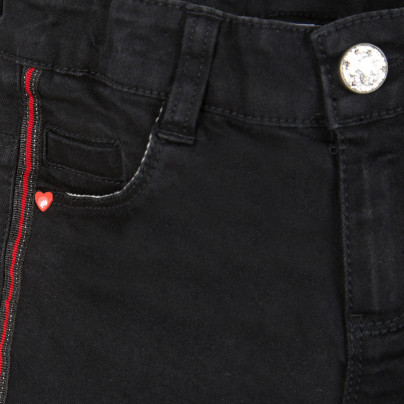 Detalhes: Linhas vermelhas e lurex prateado ao longo das costuras laterais. Um rebite vermelho em forma de coração decora o bolso frontal direito, enquanto um rebite de metal em forma de estrela adorna o bolso esquerdo. Emblema pequeno - 3POMMES - decora a parte de trás do cinto. Fivelas para cinto. Reguladores interiores.