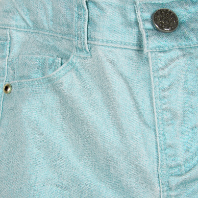 • Detalhes: Calças azul-celeste. Os bolsos traseiros são pontuados com costura de estrelas. Fivelas para cinto. Reguladores interiores.