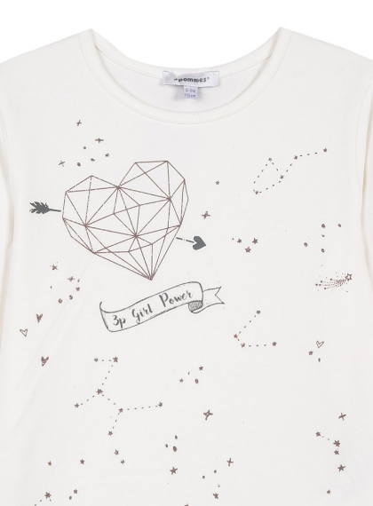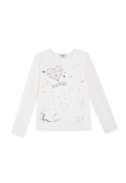 Camisola branca de manga comprida com estampa decorativa de coração geométrico e constelações.