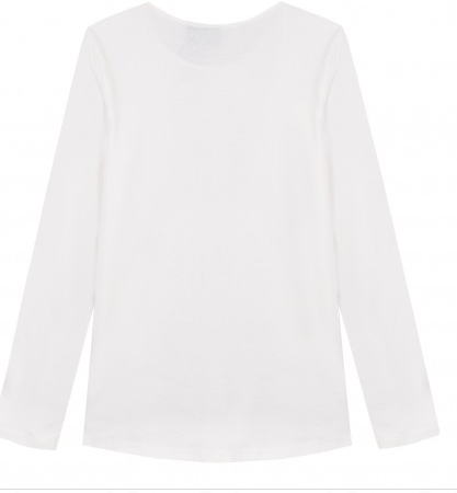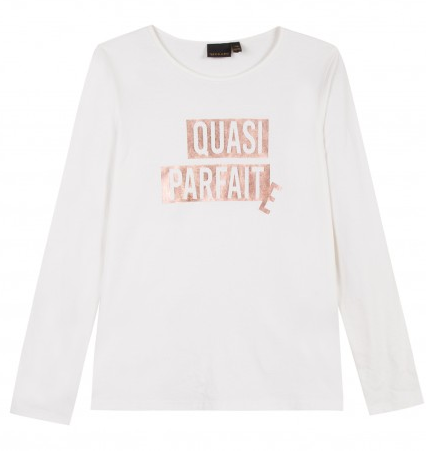 Camisola branca de manga comprida com texto rosa 'QUASI PARFAIT'
