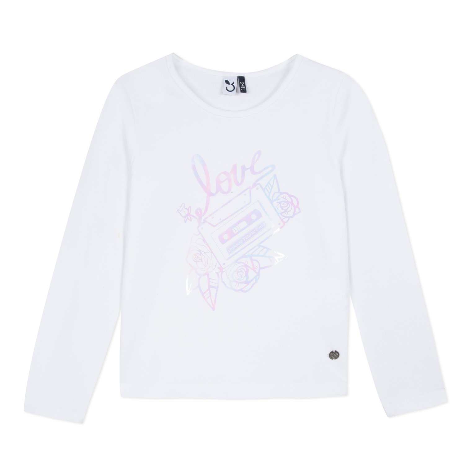 Camisola branca de manga comprida com estampa colorida e a palavra LOVE