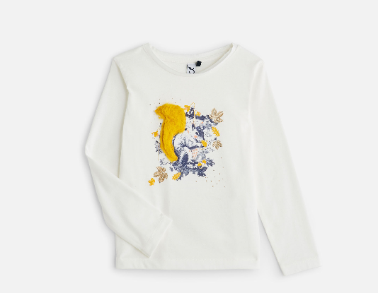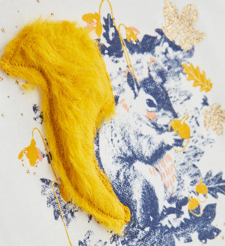 Camisola infantil branca com estampado de esquilo azul e cauda amarela felpuda