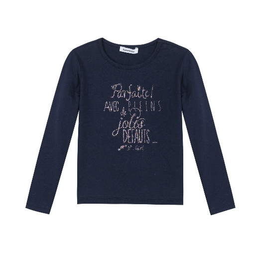 Camisola azul escuro de manga comprida com texto prateado no peito