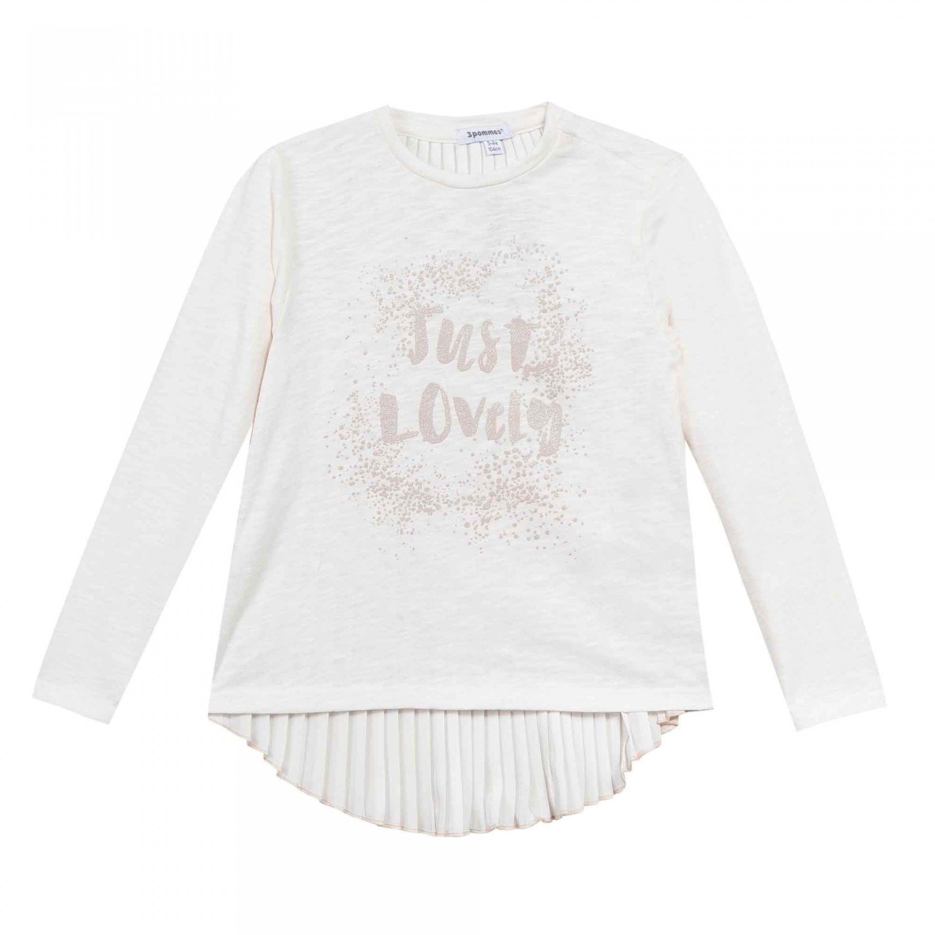 Camisola branca de manga comprida com texto JUST LOVELY e barra plissada
