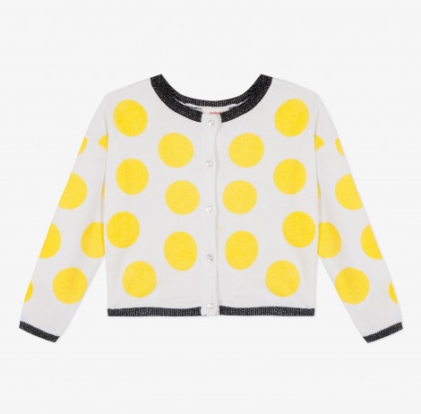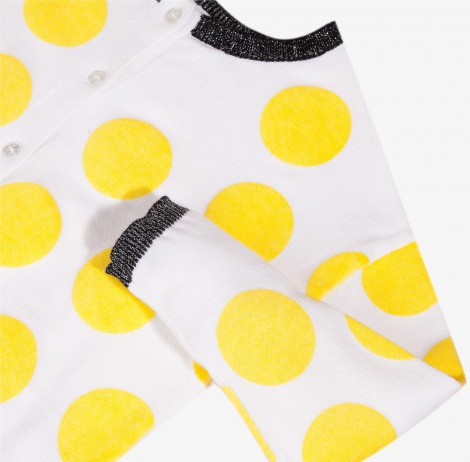 Camisola de malha branca com bolinhas amarelas e detalhes pretos brilhantes