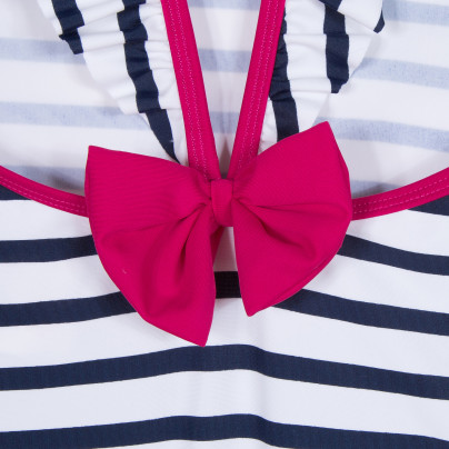 • Detalhes: Fato de banho com riscas azuis marinho com bordas rosa cereja. Laço rosa nas costas.