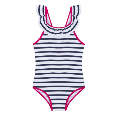 Fato de banho infantil às riscas azul marinho e branco com detalhes rosa