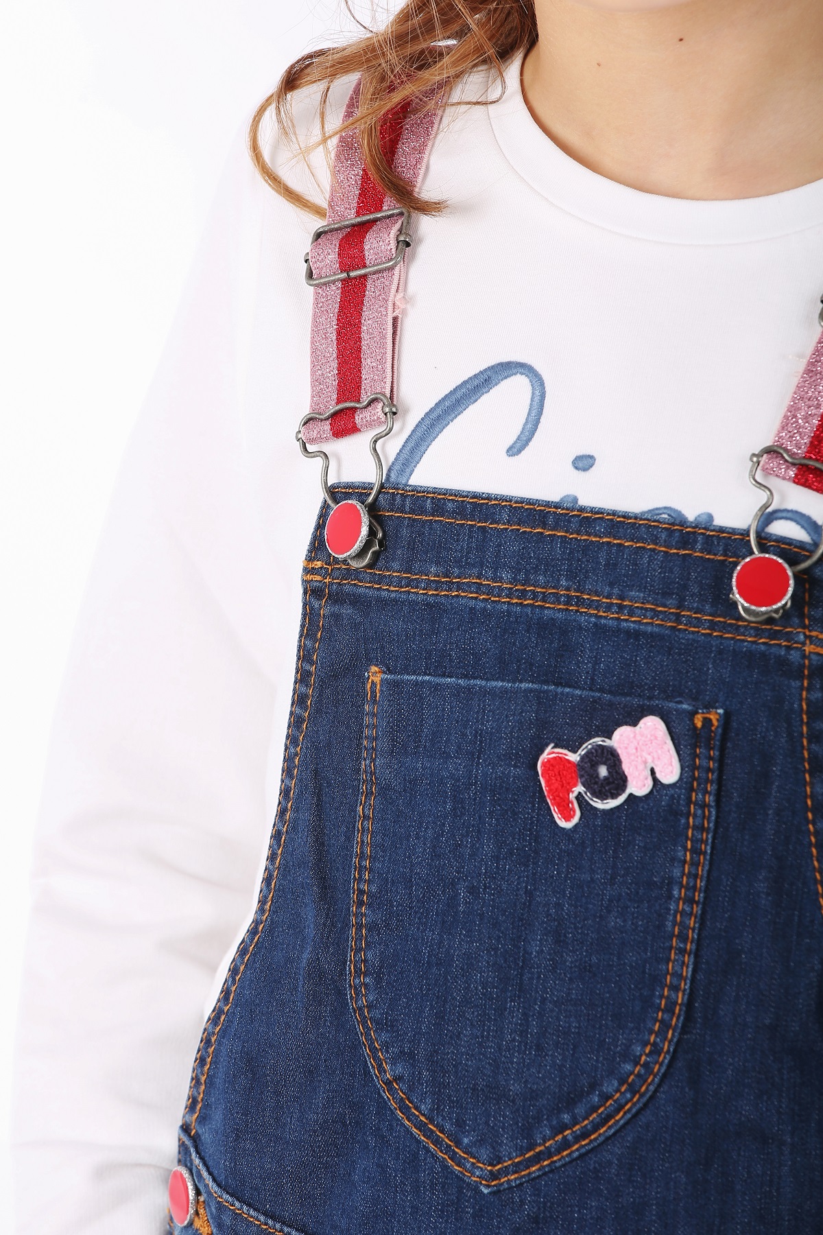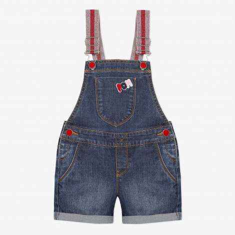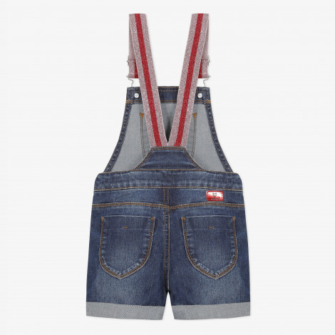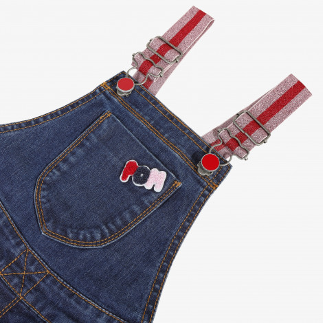 Detalhes: Macacão jeans com tiras brilhantes. Bordado colordio no bolso da frente. Correias brilhantes elásticas com gancho e fivela de metal colorido. Cintura ajustável usando abas elásticas internas. Botões coloridos nas laterais. Pespontos contrastantes. Crachá vermelho Catimini na parte de trás do calção. Lavar à máquina a 30 ° C.
