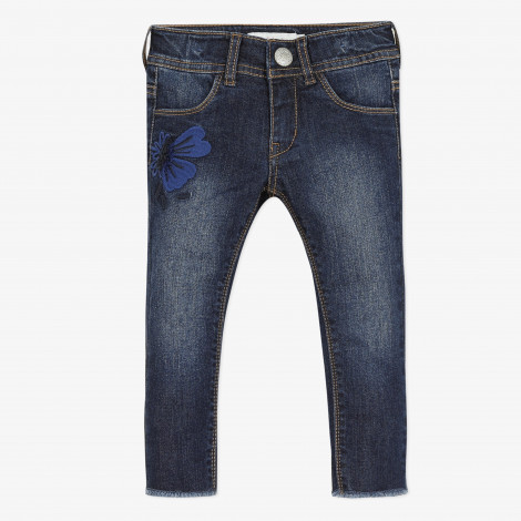 Calças de ganga infantil azul escuro com borboleta azul e botão prateado