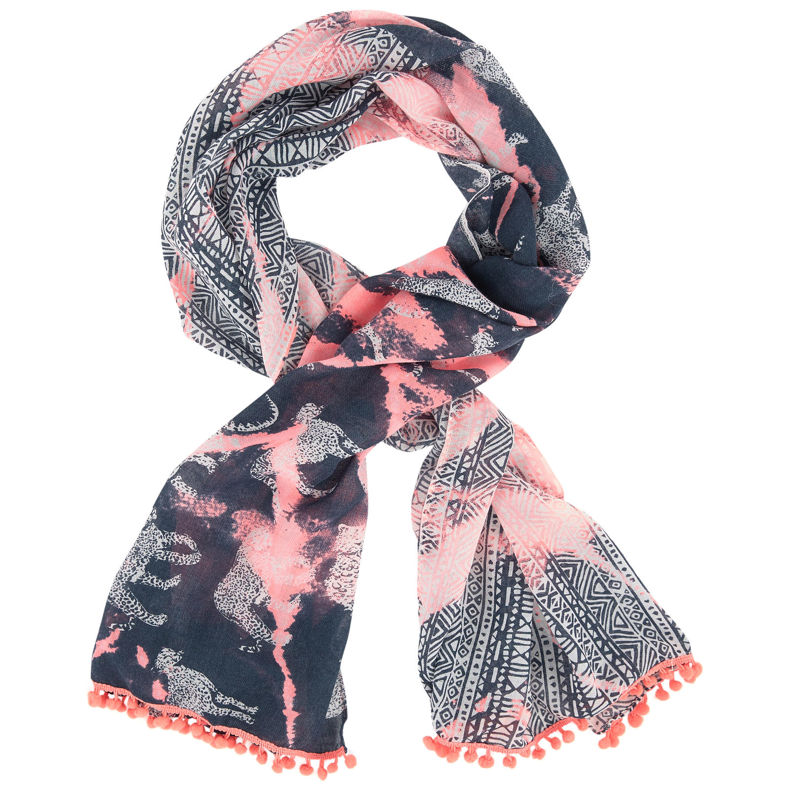 Lenço azul escuro e rosa com padrão abstracto e franjas pompom rosa