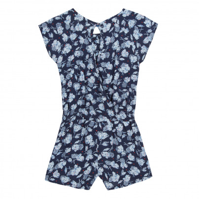 Macaquinho azul escuro com folhas brancas e detalhes vermelhos