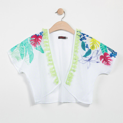 Bolero branco curto com estampado de folhas coloridas e franjas verdes, pendurado em cabide de madeira