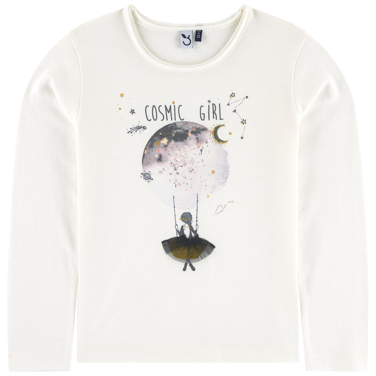 Camisola branca de manga longa com estampa 'COSMIC GIRL' e desenho de uma menina no baloiço