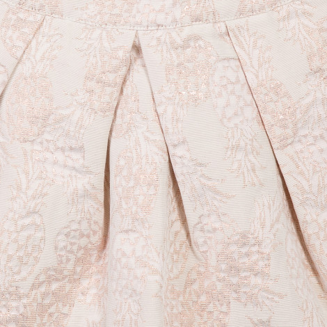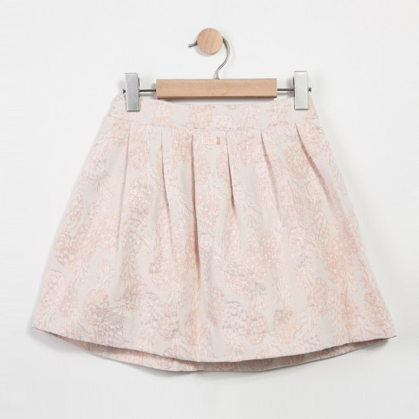 Saia rosa claro com padrão floral texturizado pendurada num cabide de madeira