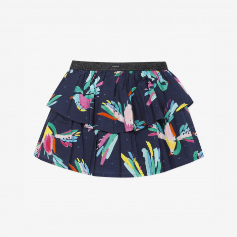 Detalhes: Saia de cintura elástica e cascata de folhos. Saia azul marinho com estampado de pássaros em aquarela. Lavar à máquina a 30 ° C. Assinatura Catimini.
