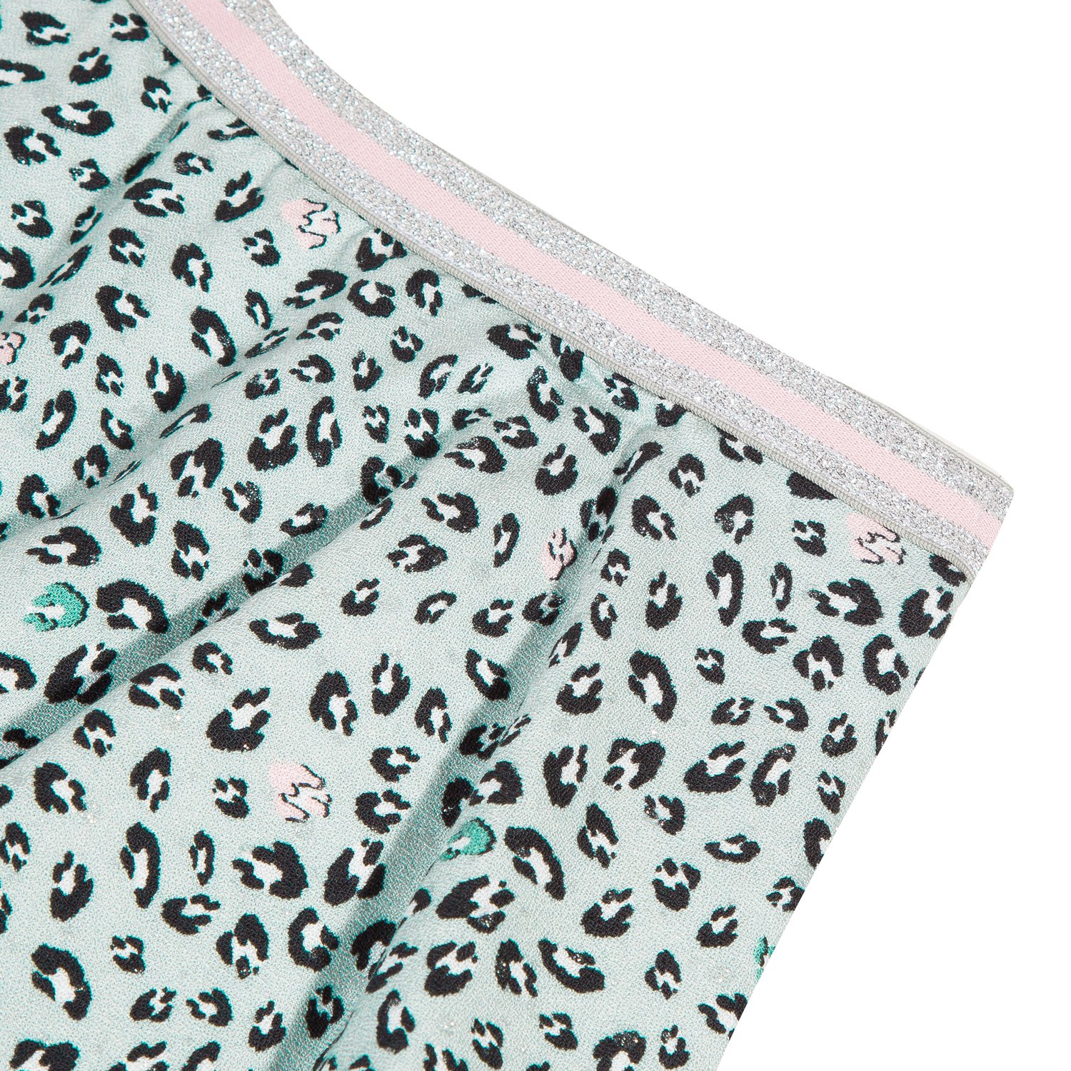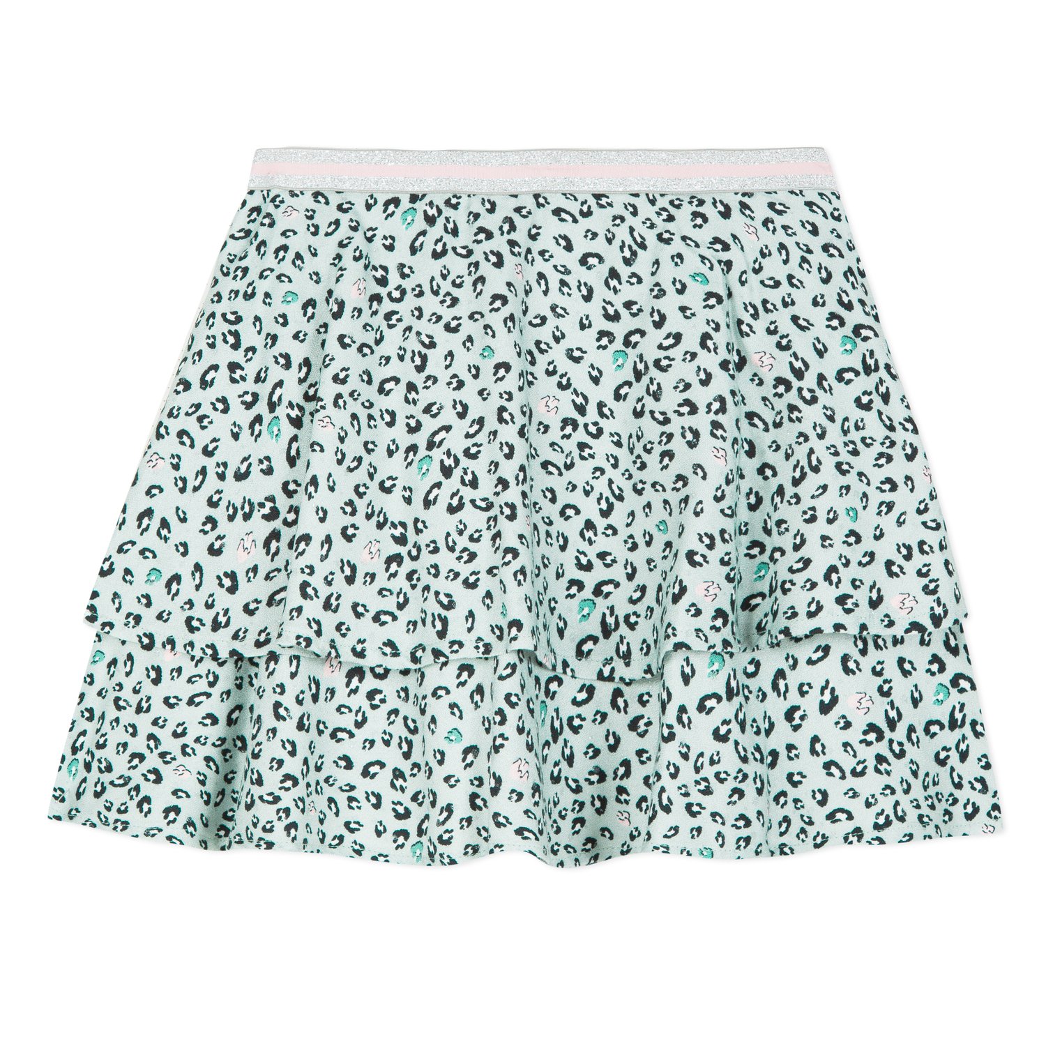 • Detalhes: Saia verde água com folhos e padrão. Faixa elástica com glitter na cintura.