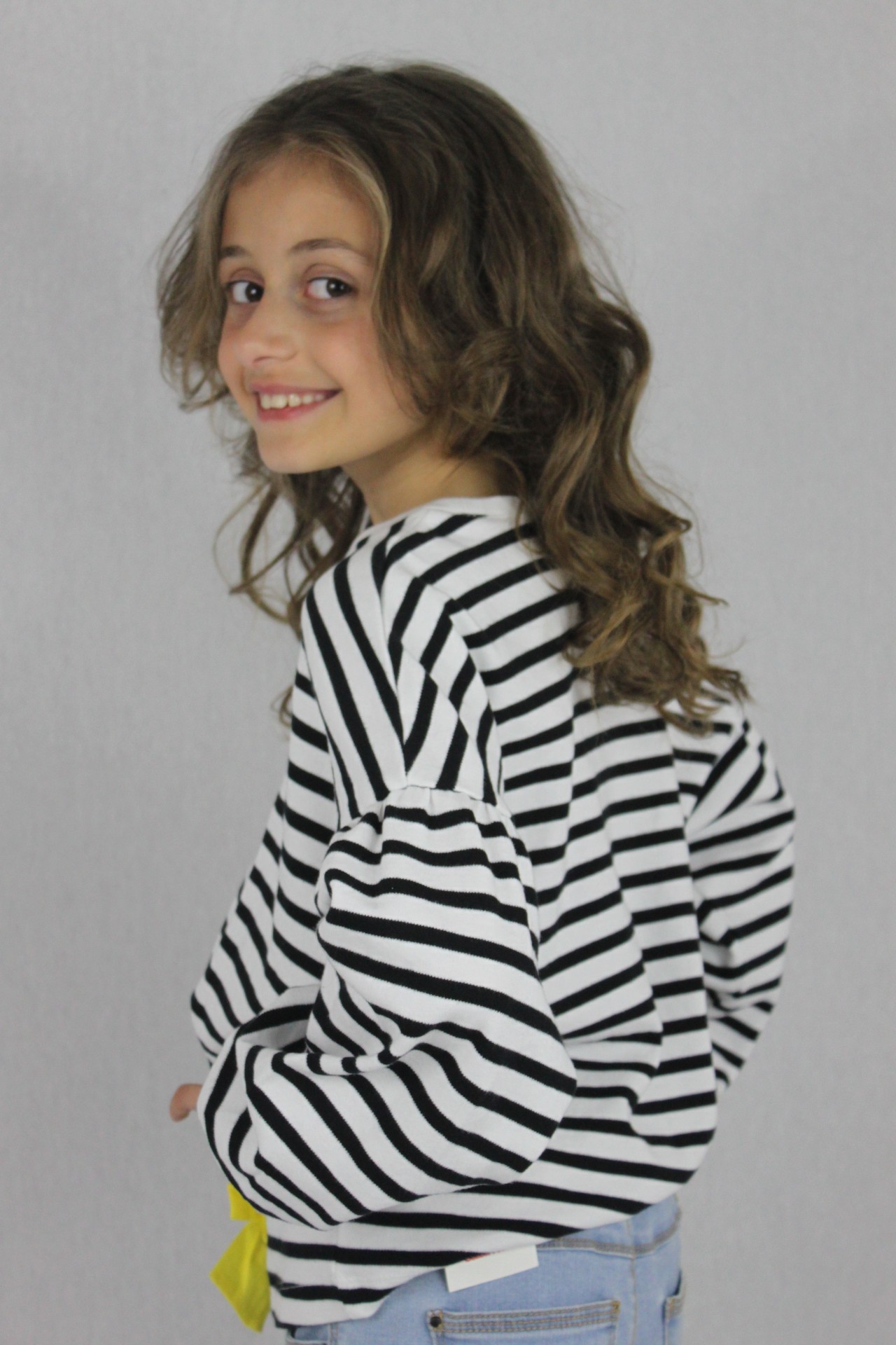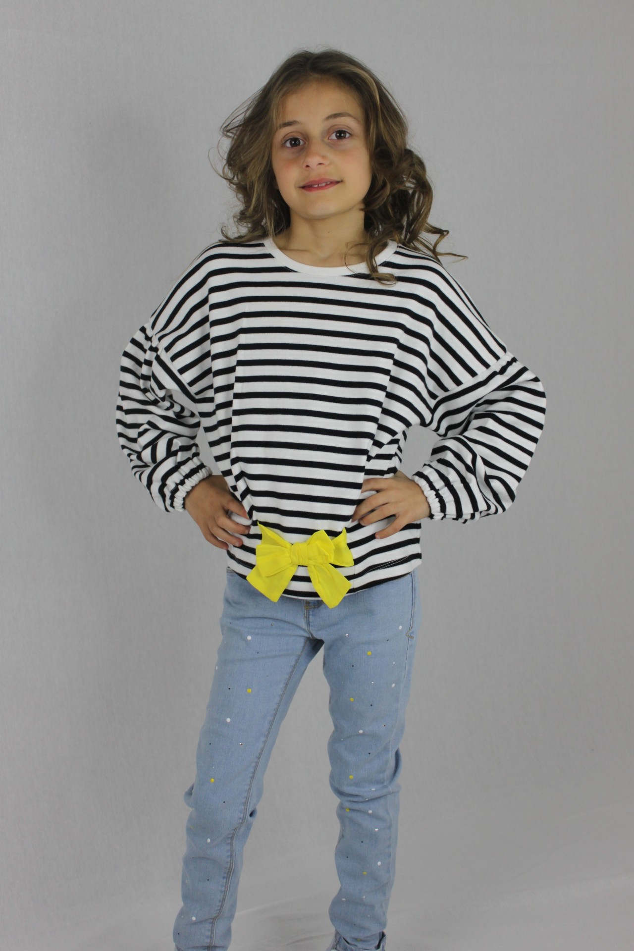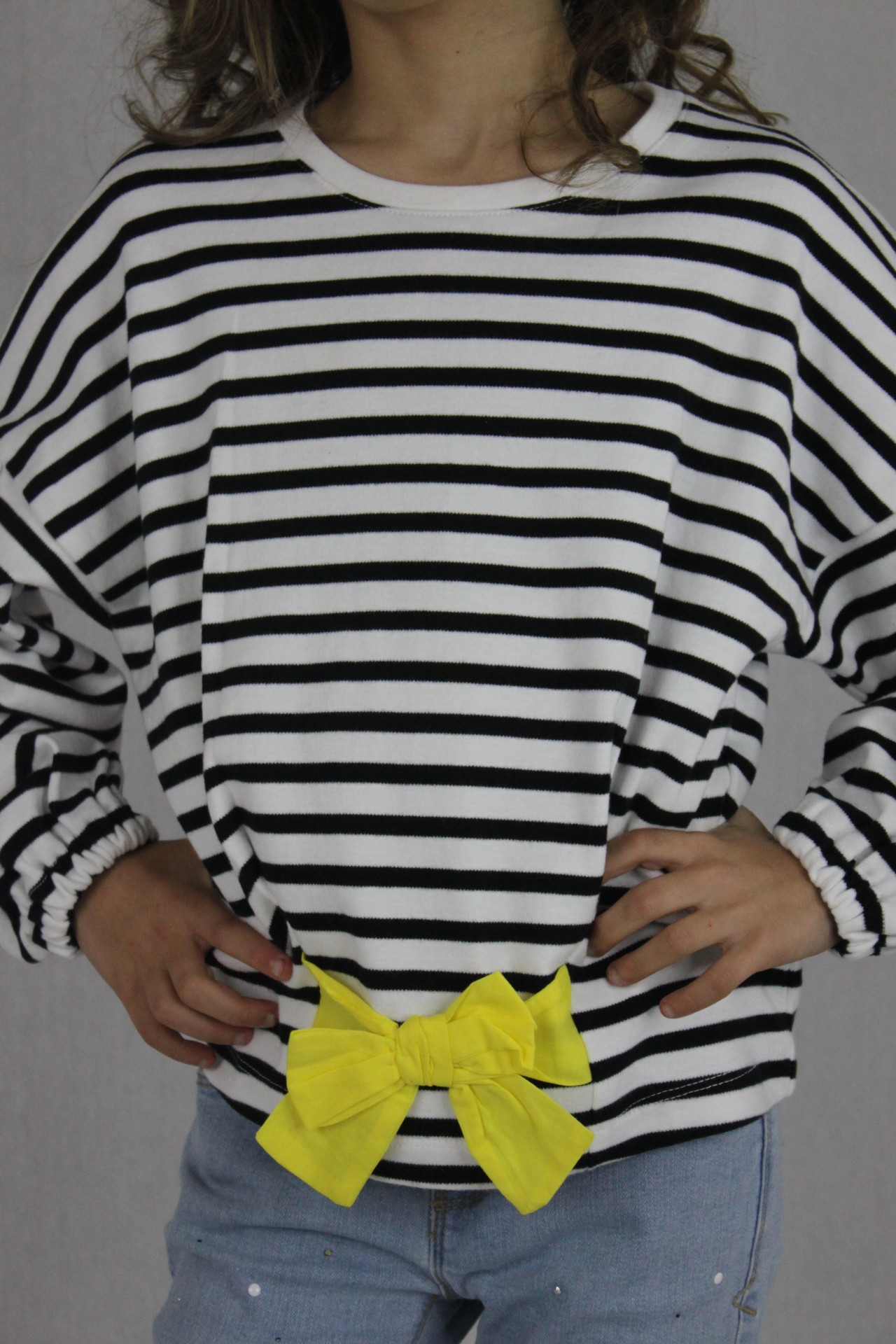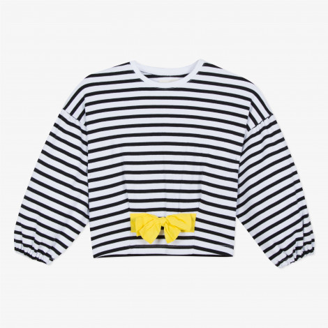 • Detalhes: Laço grande na cintura amarelo. Listras pretas e brancas. Punhos elásticos. Assinatura Catimini.
