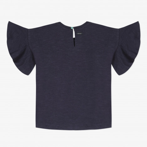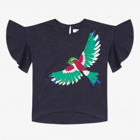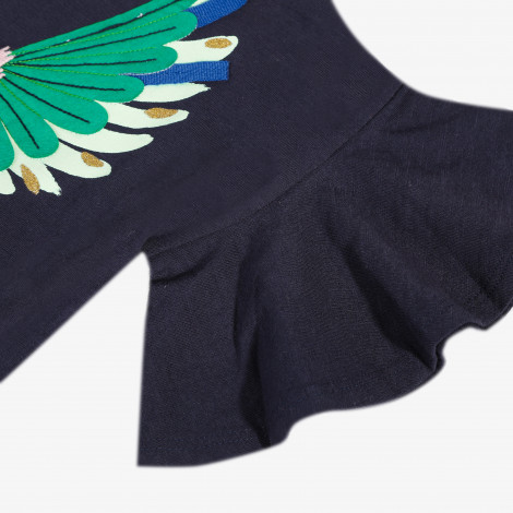 Detalhes: T-shirt azul marinho com folho nas mangas. Grande pássaro colorido em 3D, tecido e lantejoulas na frente. Arredondado e ligeiramente mais comprido na parte de trás. Lavar à máquina a 30 ° C. Assinatura Catimini.